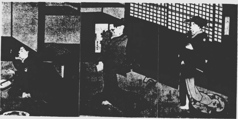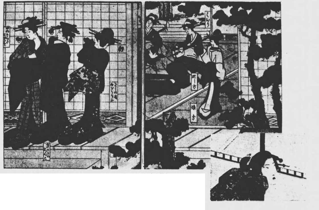 国貞によつて描かれたる深川妓風である。右端は子供(娼妓)で左端は羽織(芸妓)である。中央は羽織にあらざれば、所謂黄樽であらう。深川に於いては子供、羽織共に荼屋に来り、酒席も枕席もそこに設られた。故に子供は名符のついた寝具の包を楼子に持して子供屋から荼屋に到つたものである。吉原は客の方が妓楼に到つて笑を買ふこと現今の遊廓に於けると同じかつた。