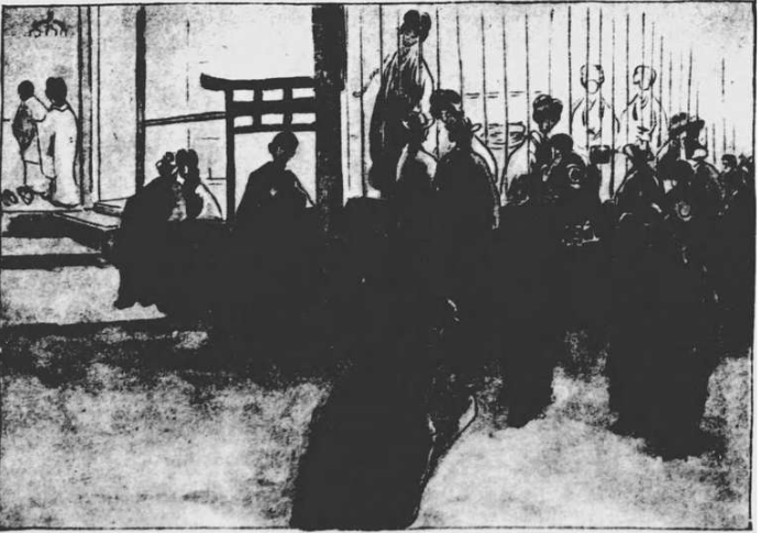 上図右は吉原娼妓の盛装。その側は禿である。同左はその「道中」の有様であり、下図は未だ張店の禁止されない前の廓内のスケッチである。